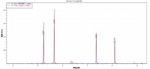供试品加标TIC图(蓝色的)与邻苯混标TIC图(白)