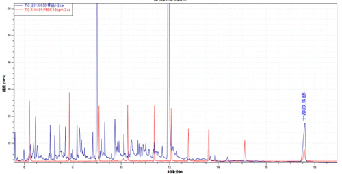 样件TIC图(黄色)与多溴联苯醚混标TIC图(灰白色)