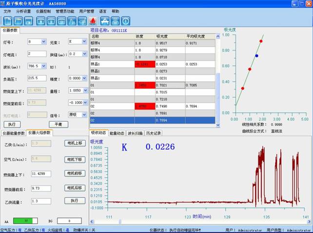 样机试验:于电子层推送光谱仪仪光波长766.5nm处,利用营造氛围-乙炔焰火,以水调零,测量试液的吸光度,减去伴同试料的空岗试 溶剂的吸光度,从日常任务曲线下知道运行的钾浓硫酸浓度。