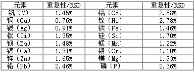 高频产生器:27.12MHz,中间通道为0.6mm的石英炬管,高频功率1100W,反射功率约50W,等离子气流量15L/min,帮助气流量1.0L/min,载气流量0.4L/min,氧气流速30ml/min,雾化室温度-10℃,爬动泵转速3ml/min。