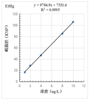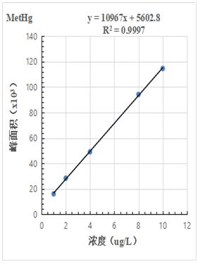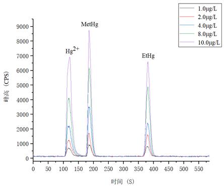 1.0µg/L、2.0.µg/L、4.0µg/L、8.0µg/L、10.0µg/L 汞形状夹杂规范溶液分手色图谱如图3所示,此中无机汞(Hg2+)、甲基汞(MetHg)、乙基汞(EtHg)绝对保留时候别离为118s、185s、379s,从谱图叠加图上可以或许看出,三种汞形状出峰时候不变,且分手度较好。