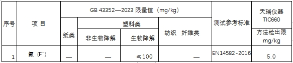 参照EN14582-2016规范,样品用氧弹熄灭仪熄灭后冷取、定容,经0.22μm水系滤膜过滤后,用天瑞仪器离子色谱仪TIC660停止测试,以保留时候和色谱峰停止定性,外标法停止定量;体例检出限5.0mg/kg,加标收受接管率为106%。经由过程本尝试成果标明,该体例检出限低、活络度高、不变性好、体例收受接管率高,且前处置体例简略,可知足快递外包装袋中氟离子的测试需要。