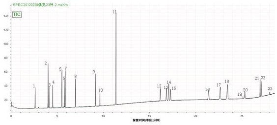2.2 23种偶氮纺织染料规范标准盐溶液TIC(总阳离子流论文检测图):