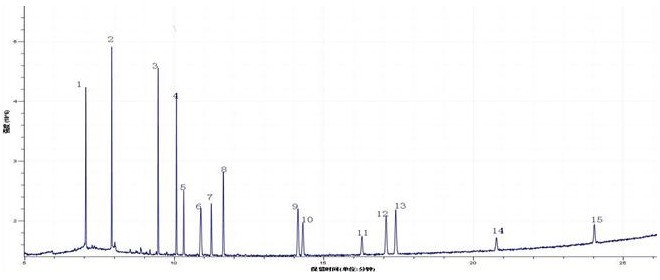 3.2 15种邻苯二甲酸酯类油料混杂要求盐溶液总亚铁离子流监测站图(TIC):