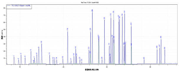 1、1,1-二氯氯乙稀 2、二氯二氧化氮 3、反式1,2-二氯氯乙稀 4、1,1-二氯乙烷 5、顺式1,2-二氯氯乙稀/2,2-二氯丙烷 6、溴氯二氧化氮 7、氯仿 8、1,1,1-三氯乙烷 9、1,1-二氯丙烯/四氯化碳 10、苯/1,2-二氯乙烷 11、三氯氯乙稀 12、1,2-二氯丙烷 13、二溴二氧化氮 14、一溴二氯二氧化氮 15、順式1,3-二氯丙烯 16、甲苯 17、反式1,3-二氯丙烯 18、1,1,2-三氯乙烷 19、四氯氯乙稀 20、1,3-二氯丙烷 21、二溴氯二氧化氮 22、1,2-二溴乙烷 23、氯苯 24、1,1,1,2-四氯乙烷 25、乙苯 26、间/对二甲苯 27、邻二甲苯 28、苯氯乙稀 29、溴仿 30、异丙苯 31、溴苯/1,1,2,2-四氯乙烷 32、1,2,3-三氯丙烷 33、正丙苯 34、2-氯甲苯 35、1,3,5-前三基苯 36、4-氯甲苯 37、叔丁基苯 38、1,2,4-前三基苯 39、仲丁基苯 40、1,4-二氯苯 41、4-异丙基甲苯 42、1,3-二氯苯 43、正丁基苯 44、1,2-二氯苯 45、1,2-二溴-3-氯二氧化氮 46、1,2,4-三氯苯 47、六氯丁二烯 48、萘 49、1,2,3-三氯苯