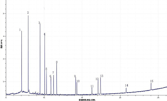 3.1 15种塑化剂夹杂着正确悬浊液总化合物流数据监测图(TIC)下面一样: